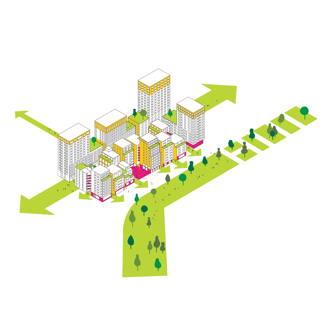 This new urban area now functions as a hybrid between a super-dense city block, a campus, and a village.