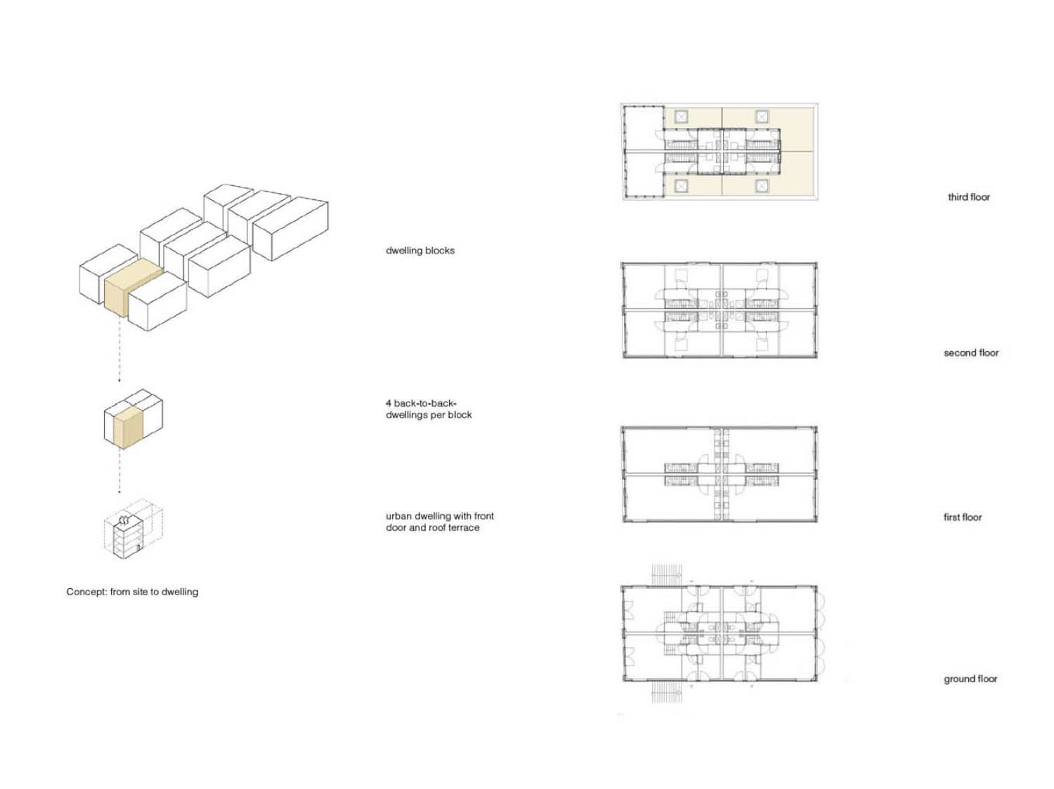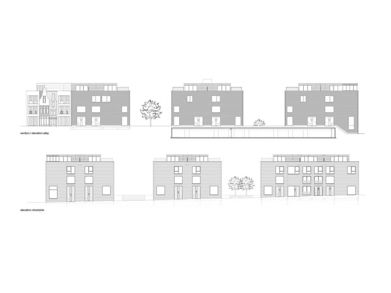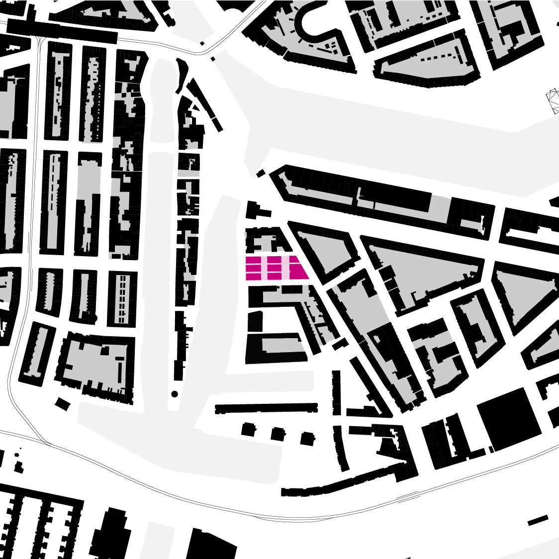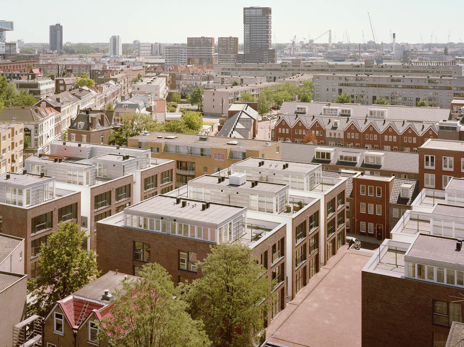 The Delfshaven area in Rotterdam is one of the very few locations where delicate fragments of historic urban tissue have been preserved. This project relates to the essence of the old heritage of this area: the scale and grain of the historic city and its network of public space, with squares and alleys. Contrasting the newer generations of surrounding building blocks, this project provides a subtle transition between the public and private domain. In 8 small urban blocks, 4 family dwellings have been organized back-to-back. A semi-sunken parking garage is located under the plan and the squares. The dwellings encroach on the garage to ensure friendly and inhabited facades along all streets.