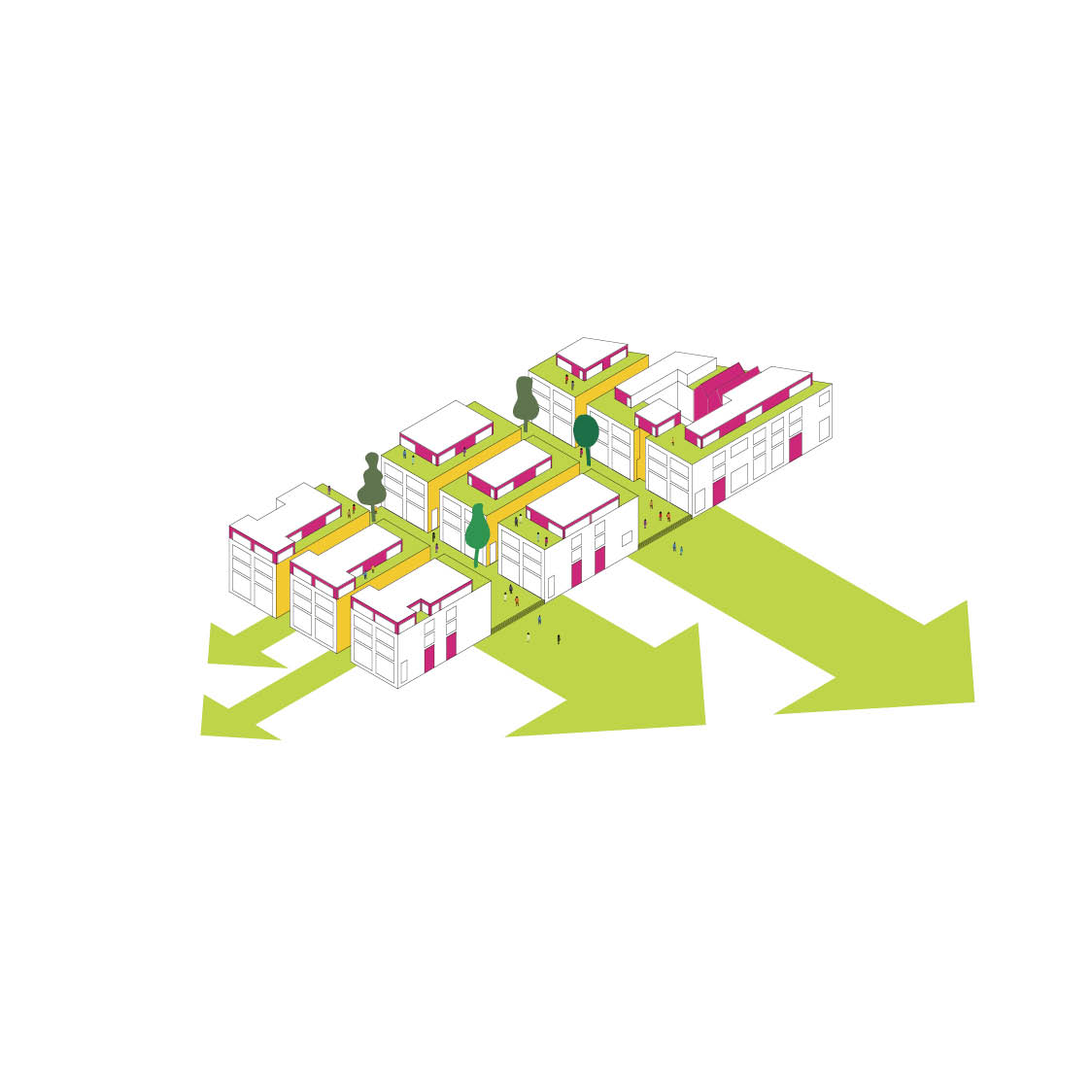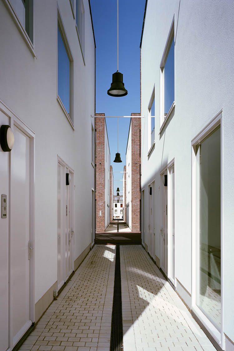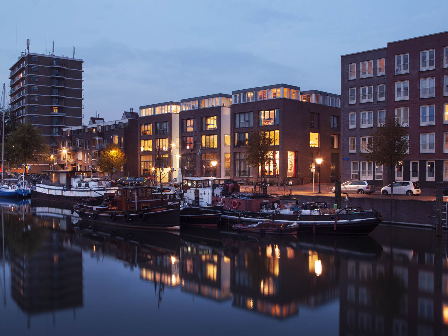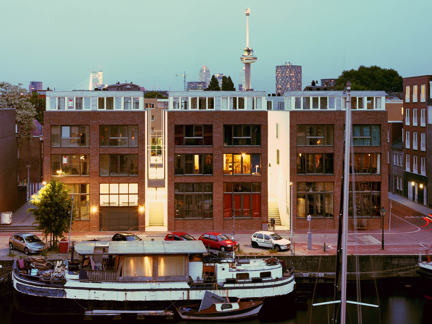 The Delfshaven area in Rotterdam is one of the very few locations where delicate fragments of historic urban tissue have been preserved. This project relates to the essence of the old heritage of this area: the scale and grain of the historic city and its network of public space, with squares and alleys. Contrasting the newer generations of surrounding building blocks, this project provides a subtle transition between the public and private domain. In 8 small urban blocks, 4 family dwellings have been organized back-to-back. A semi-sunken parking garage is located under the plan and the squares. The dwellings encroach on the garage to ensure friendly and inhabited facades along all streets.